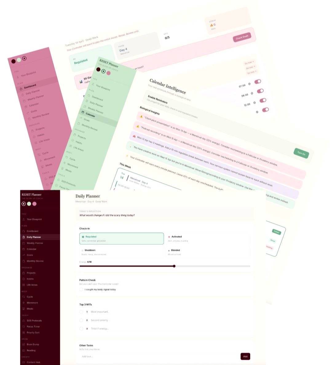 → Tracks your cycle, movement, meals, goals, habits, content, and monthly reviews — all in one place, all mapped to your biology